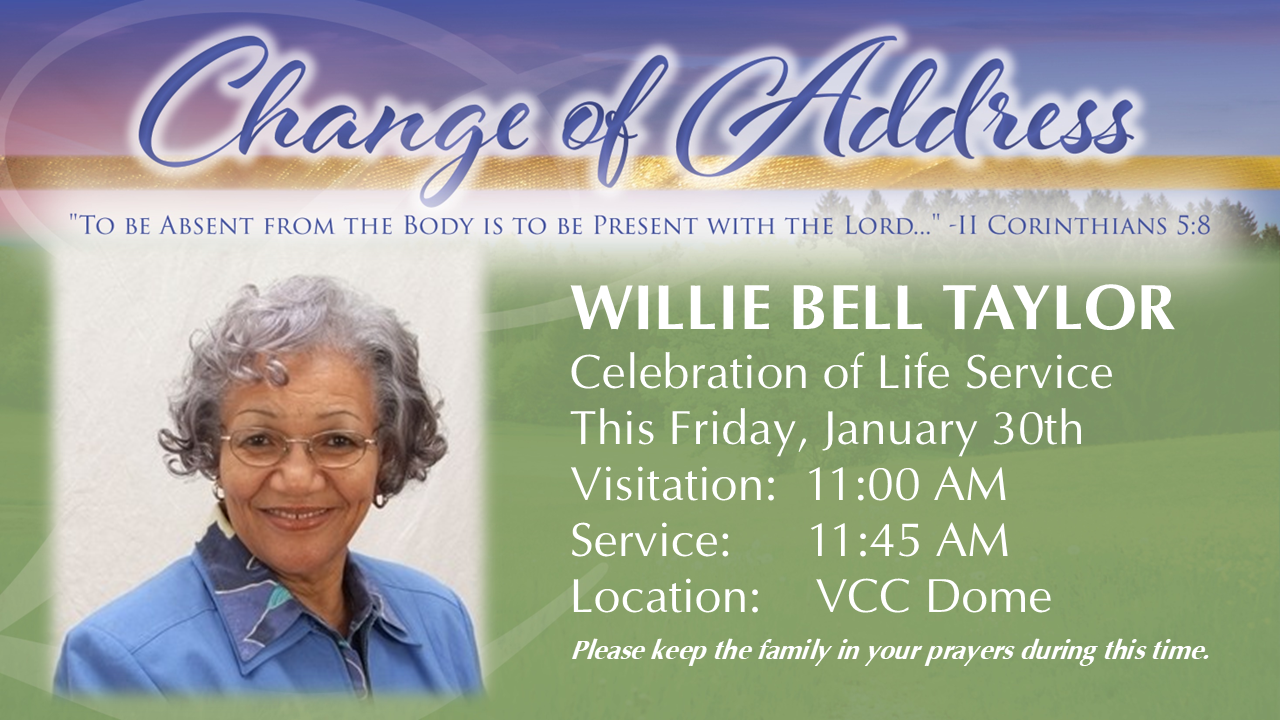 (Member) Willie Bell Taylor passed. The Celebration of Life Service will be held Friday, January 30, here in the Dome. The visitation is at 11 AM followed by the service at 11:45 AM.